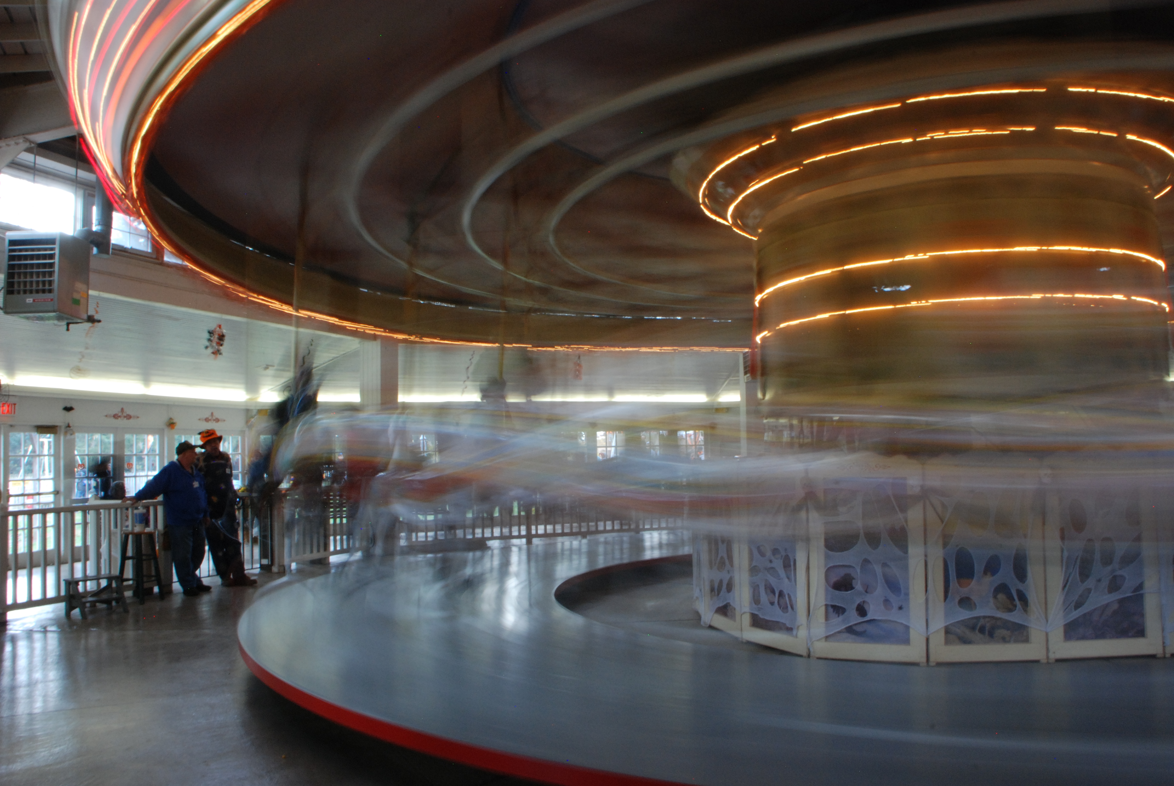 What I find amazing is that what used to be a thrill ride, the carousel, is now a meek and mild ride. In the early 1900’s carousels turned at a very fast rate of speed. There are still a few of those antique carousels that travel at original speeds, or even at lowered speeds that are still very fast. I rode one at the Herschell Carousel Factory Museumin North Tonawanda, New York. The ride had been slowed down, but because it was designed as a thrill ride it was still very fast. The fastest carousel in Michigan is located at Crossroads Village and Huckelberry Railroad. This antique carousel goes so fast it is hard to capture in a picture at full speed, but photos shows how fast it is moving. Carousels in modern times go up and down at a much slower pace, but other amusement park rides are constantly being built to move at extreme speeds, with the main focus on roller coasters.