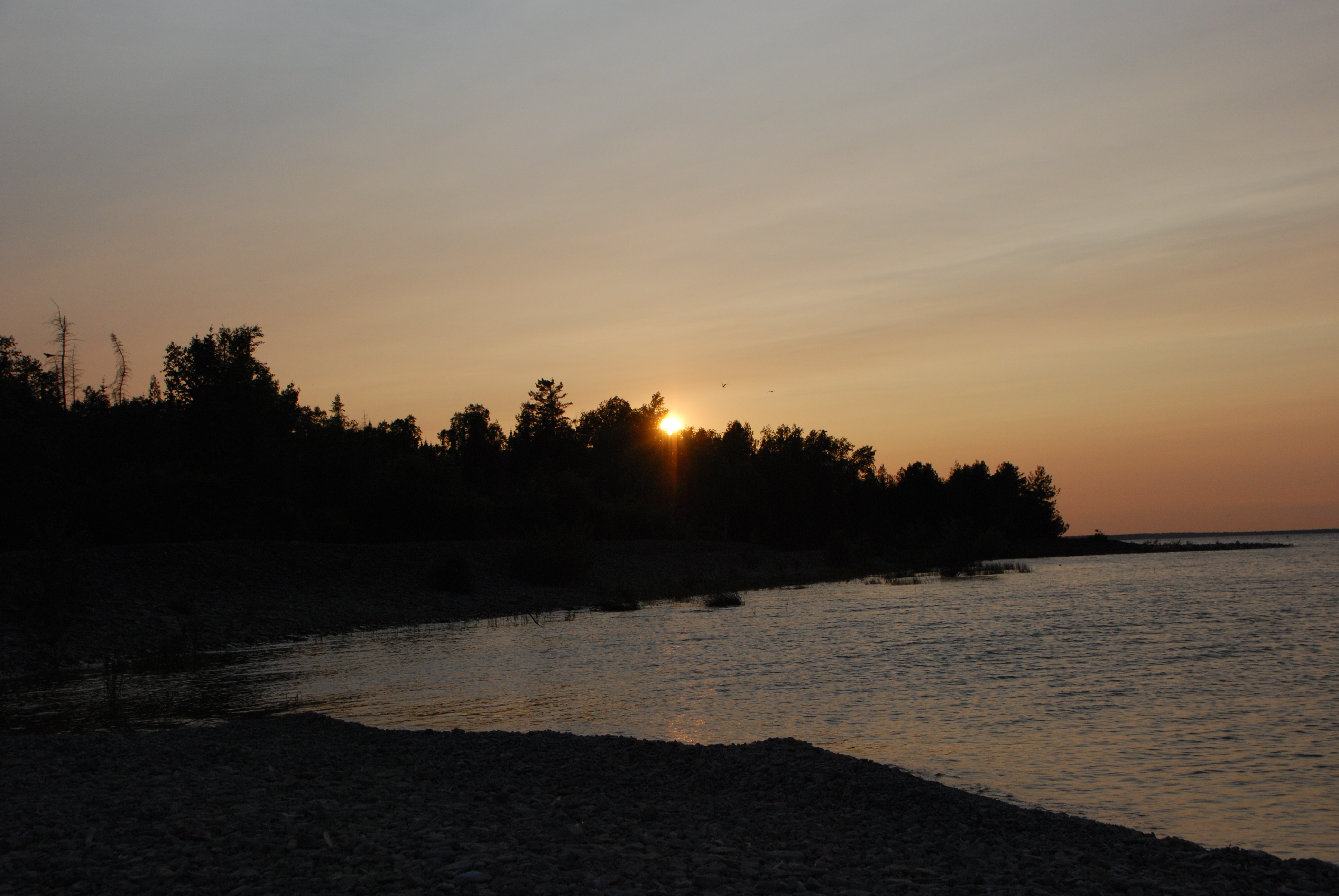 As the golden hour approached we ventured down to the beach and fire pit area to light a fire and watch the sunset.  The beaches here are not sand, they are covered in limestone/shale rock.  As we watch the sunset over Lake Huron we notice that a huge flock of seagulls nest on a strip of land that juts out into the lake, and they periodically take off in large groups for a moment before once again landing on their nesting area.