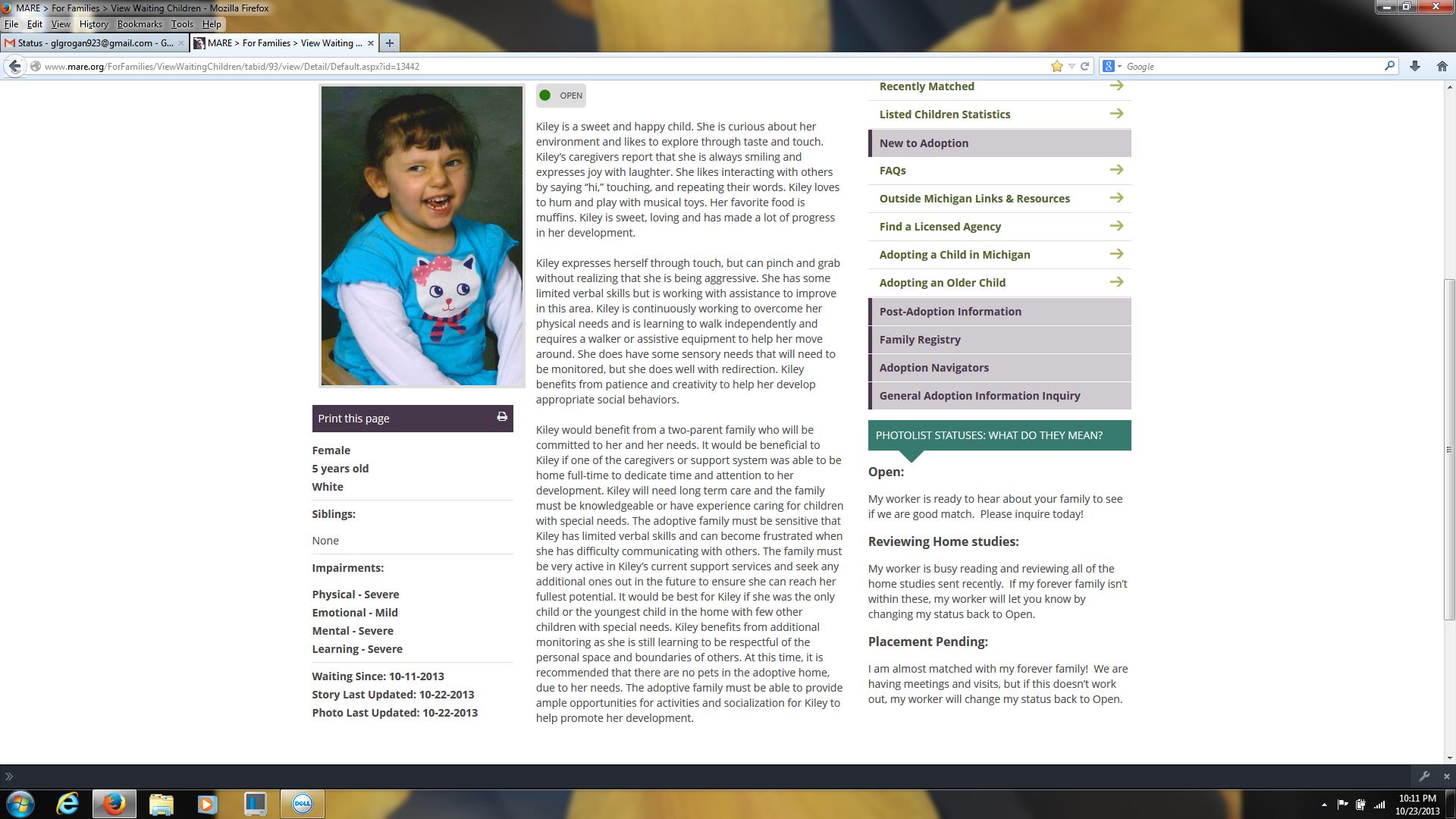 Bethany Christian Services did recommend we adopt the older granddaughter, Kiley, who had suffered severe brain trauma at seven months of age and is visually, mentally and physically handicapped. We also discovered that Kiley had been listed on the MARE.org website, incorrectly stating that she has no siblings when she has a full-biological sister and a half-sister who had also been placed into foster care, plus she has another half-sister by a different mother. Although they never indicated she had been matched with us, her biological grandparents, almost immediately after the adoption agency indicated that another family was “interested” Kiley’s Status on MARE.org changed to “My name is KILEY and I was matched with a recruited family on Friday September 19, 2014.” The original MARE.org listing is shown at the bottom of this posting. As of this date we have never received an official denial from William Johnson regarding our application to adopt Kiley.