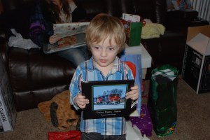 Once Rob was out of work they all came over to our house, arriving around 2 pm for pizza and gift opening. This worked out perfect as Austin was then able to go home and play his new and #1 gift wish, Skylander, before leaving to go to his dad’s for the rest of his Christmas break. Corbin, who will be 4 on the 30th of December, was thrilled with his Thomas The Train tracks, his fire engines and cars. He is a kid that likes anything with wheels, but his number one love is trains. Alexandria, just born on the 12th of December slept through the entire event. She looked adorable in her “Baby’s First Christmas” shirt sleeping away.