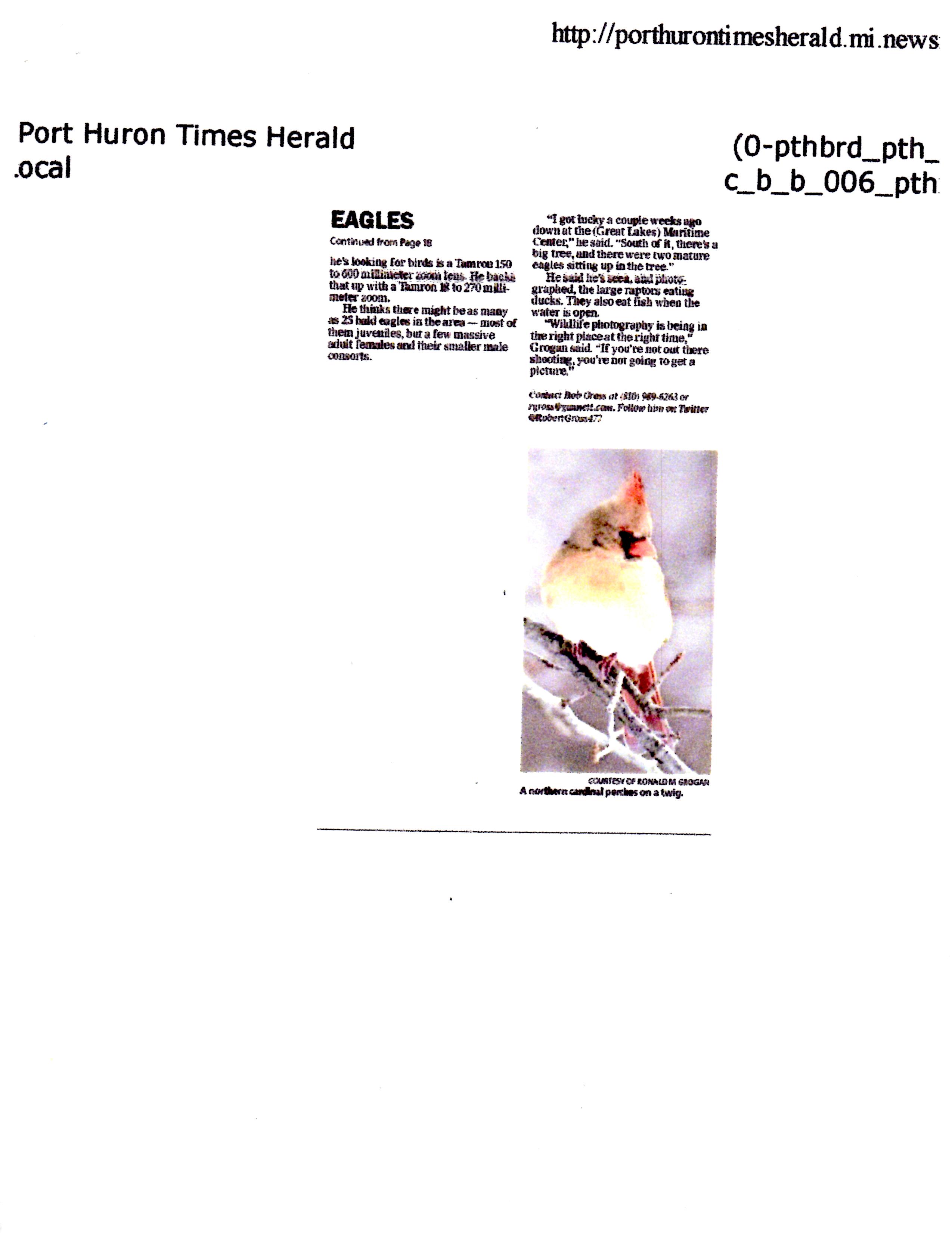 An article in the Port Huron Times Herald Newspaper recently featured Ron and his photography of eagles. My post this week is a “husband brag” about Ron and his photographs of the American Bald Eagle, as well as other birds. Birds are not easy to photograph, but Ron accomplishes the task successfully on a regular basis. If you click on the article and photographs they should enlarge for better viewing. You can then hold down the control key and roll the wheel on your mouse to enlarge the article further for easier reading. The photographs at the end of the page can be viewed in a larger format as a slideshow.