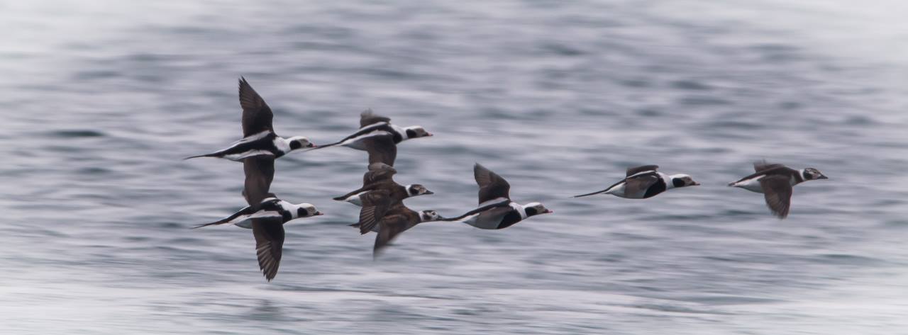 Long Tailed Ducks in Flight, copyright Ron Grogan 2015