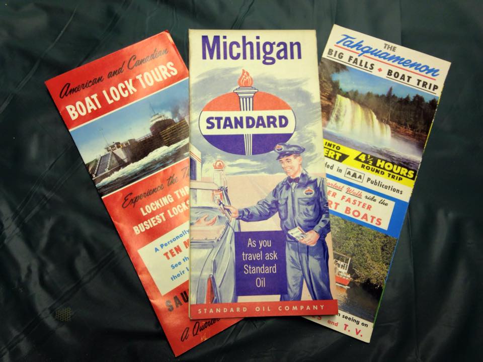 Honeymoon brochuresThe items are an interesting assortment, too many to list here.  I did take a few cell phone pictures of some of the “treasures”.  My grandmother’s wooden rolling pin and wooden board.  My grandfather’s pipe stand and his favorite pipe.  Beautiful china bowls.  A Stein from Germany.  Jigsaw puzzles with very thick pieces.  My father’s first camera  and his toy holster set from when he was a child.  My parents wedding cake top and some brochures, road map and placemats from their honeymoon.