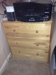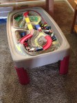 - Little tikes toy box, most of the toys inside, the truck on top, the Little Tikes Bookshelf with the books and puzzles on it, and the children’s stand-up play table