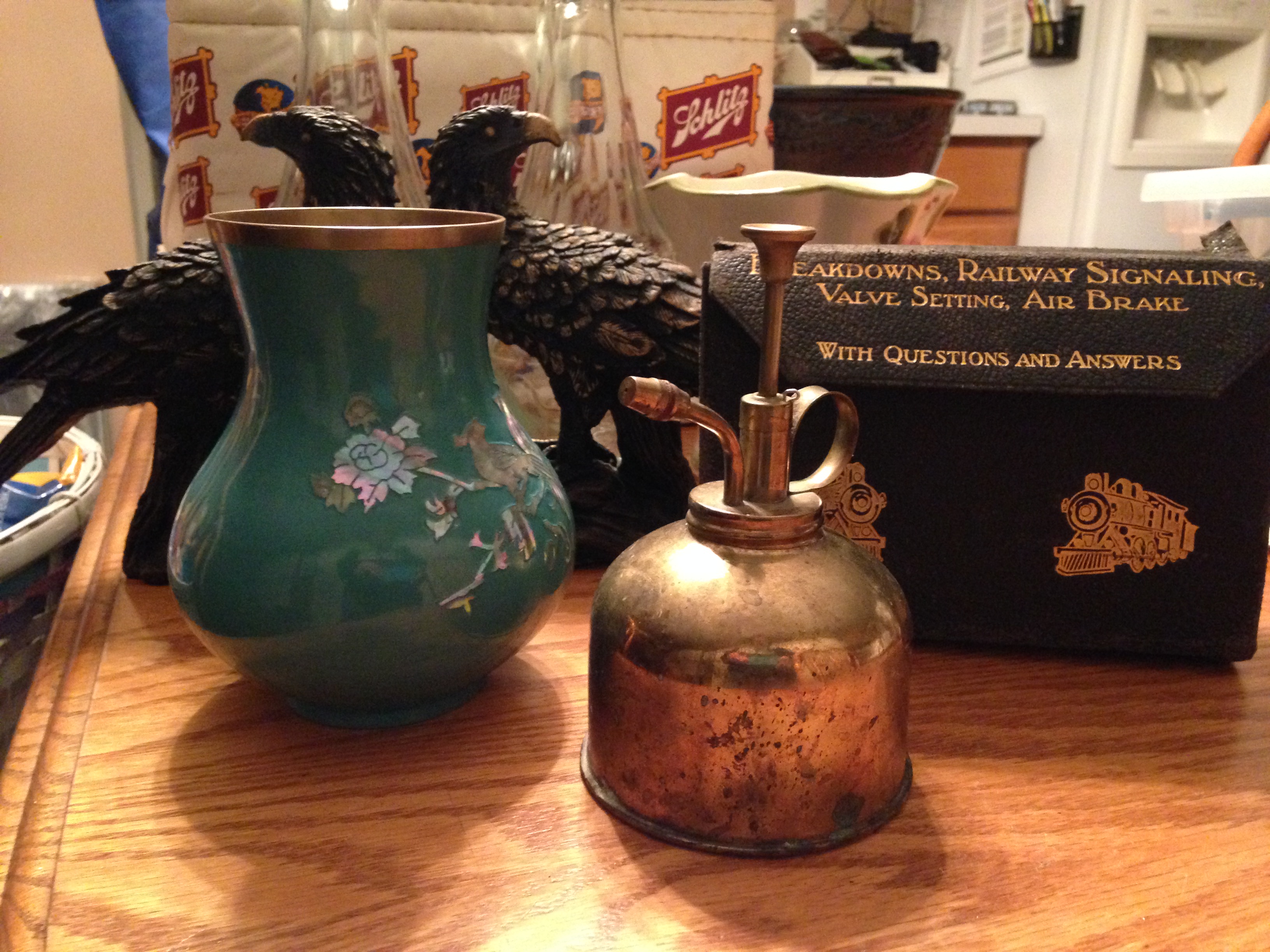 So, now my house is overrun with items we have to figure out where to put.  A huge box of vinyl records…why?  I don’t know.  About 8-10 books he purchased for me, plus 3-4 for himself.  Neat paintings of male and female Indians, plus an Indian blanket we are going to use as a bedspread/comforter on our water bed.    Antiques he got in auctions, including an antique train book, two antique ice buckets and a wine/champagne chiller, vases, cruets, train cars, accessories, and I believe a model train to add to his set-up, plus a large box of Precious Moments figurines he purchased for me, and much more.