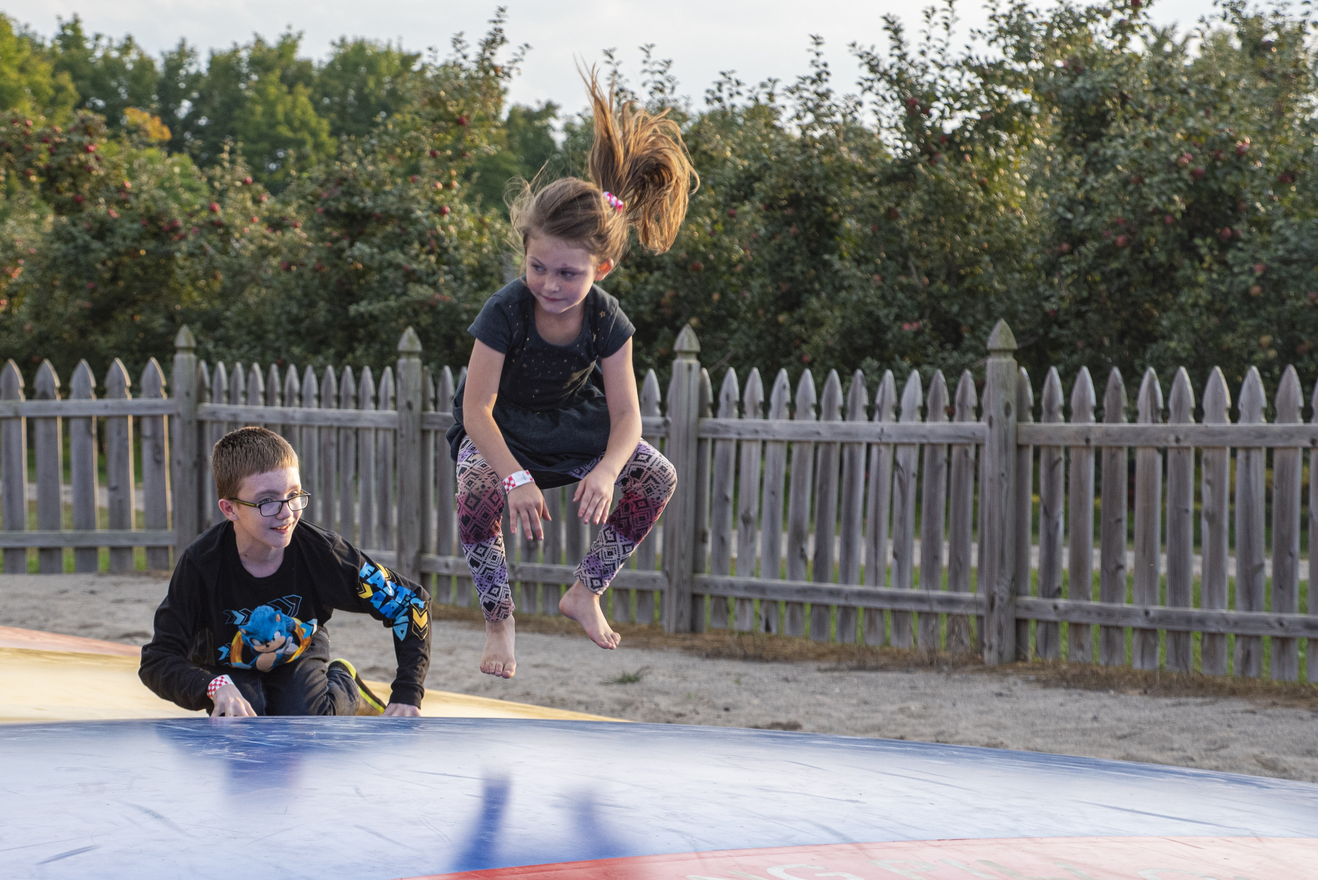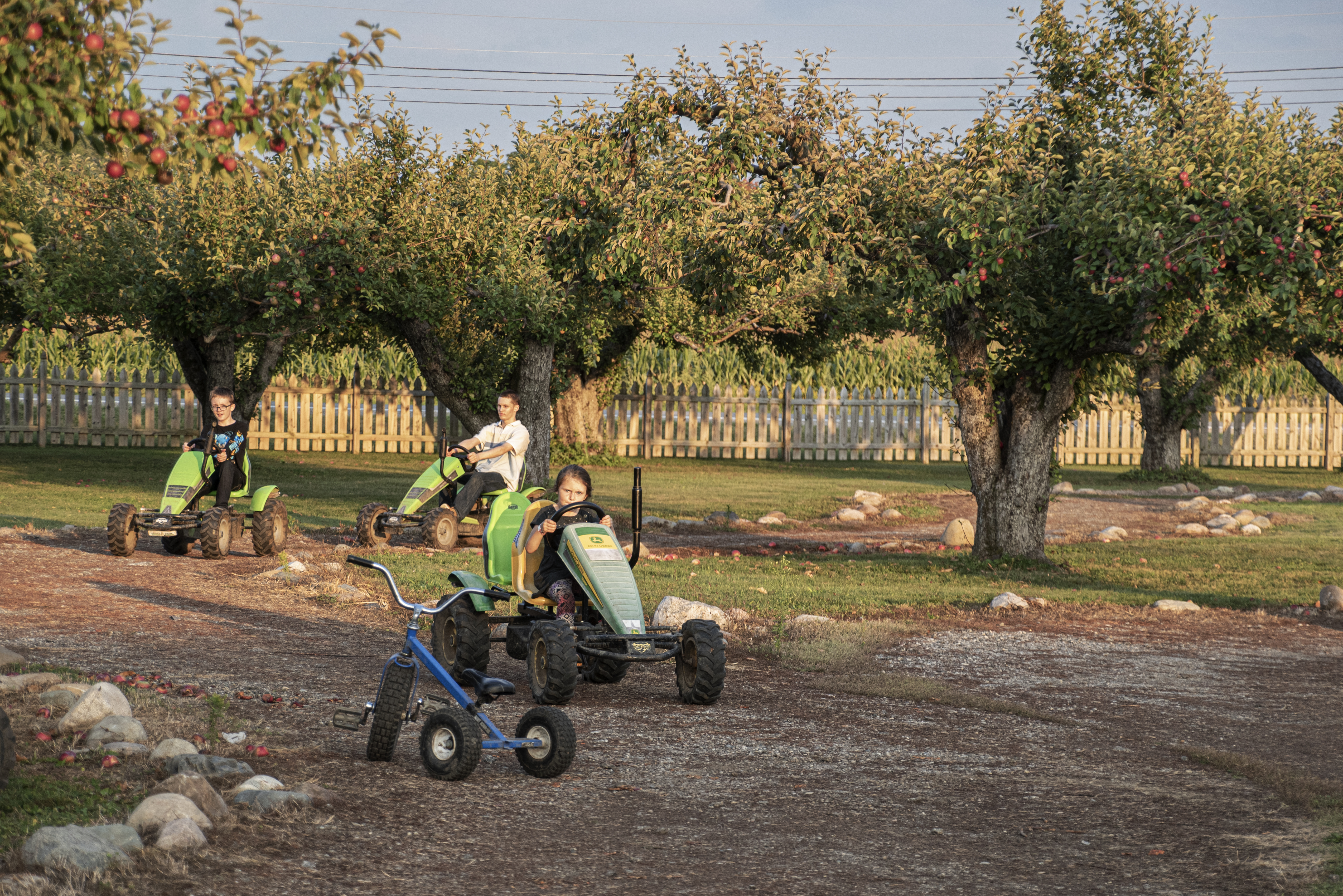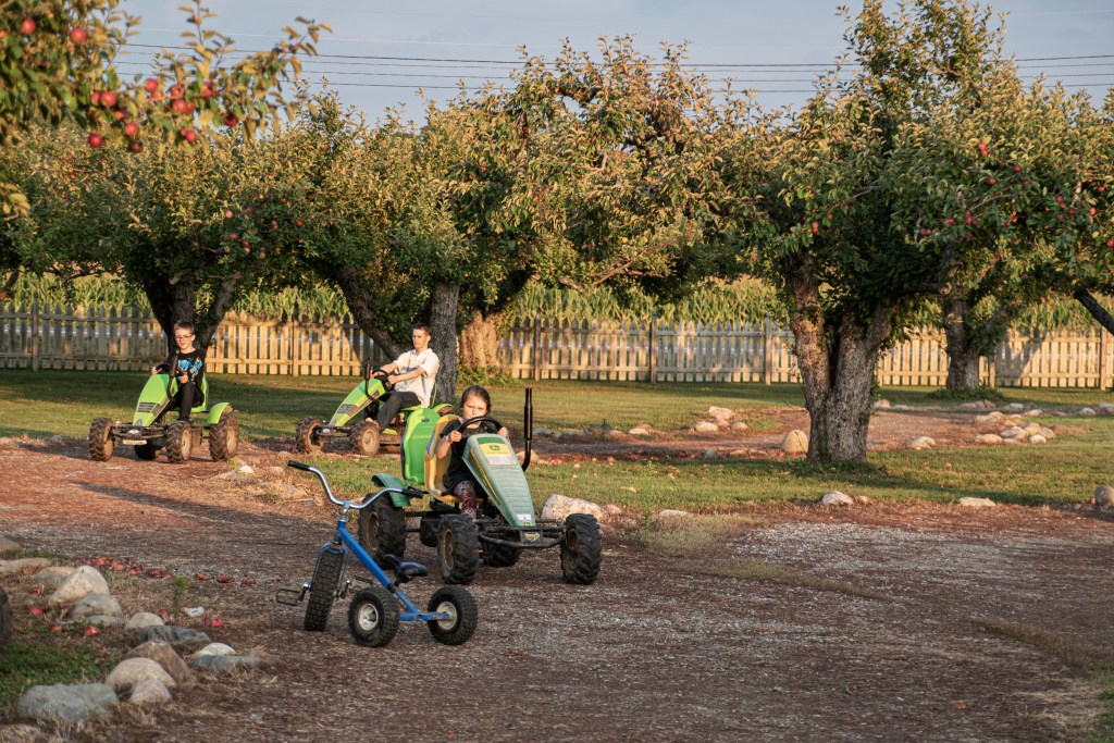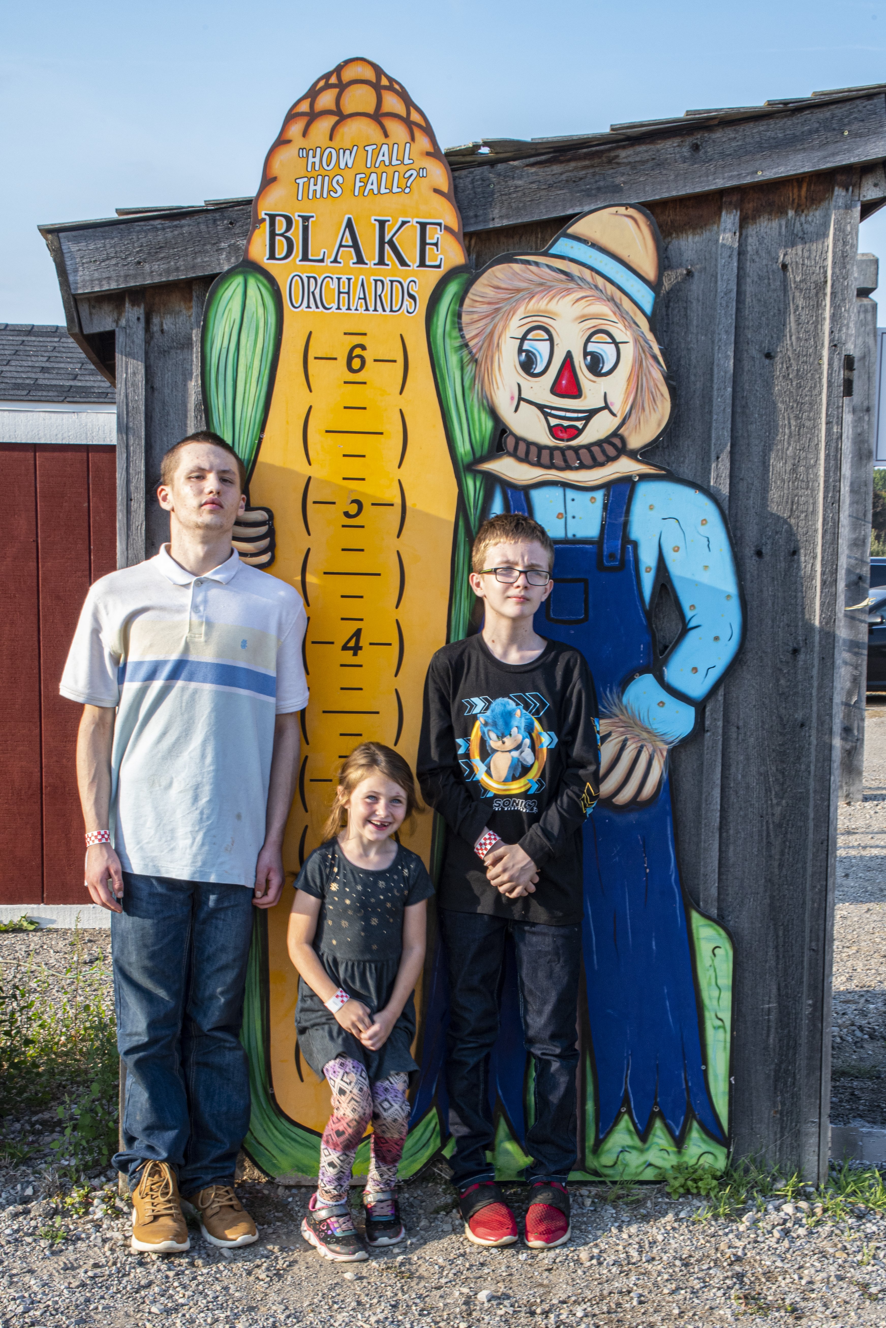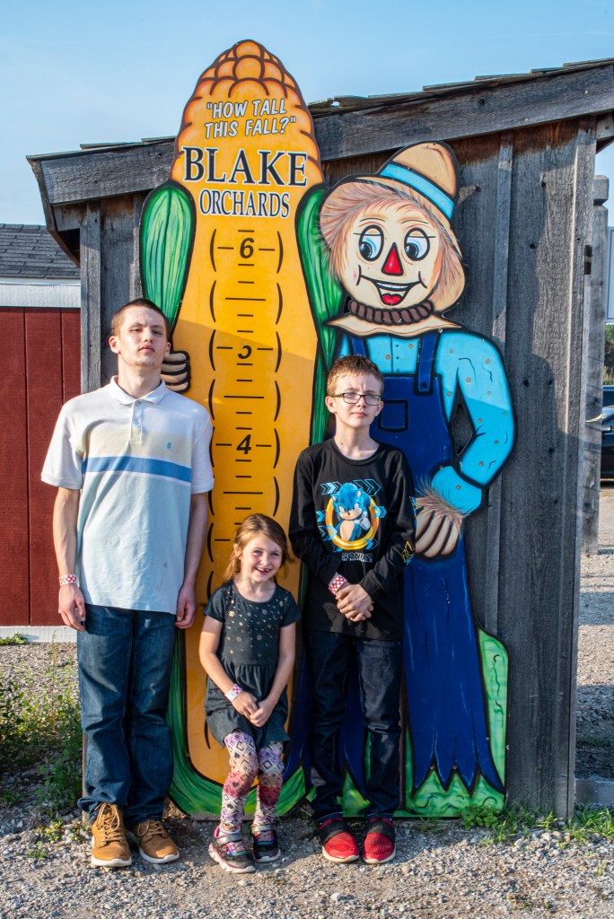 Alex leads the way, with Corbin and Austin following behind on the pedal vehicles. Corbin and Alex enjoy the bounce pads. Austin, Alexandria, and Corbin stand by the “How Tall This Fall?” display at Blake’s Big Red Apple.