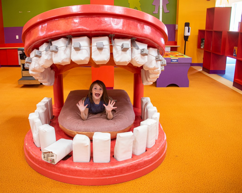 With everything from car driving, medical and dental areas, scientific activities, wall climbing, water activities, art center,  large tinker toy building, play kitchen area, play farm area, and more, she was on the go constantly. She took home artwork she made and a toy from the gift shop. We were there for about four hours and closed the place down.