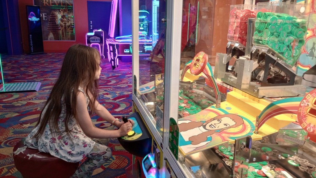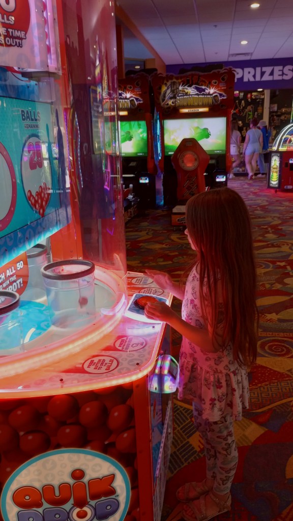 On our first trip there, we spent quite a bit of time in the arcade. Corbin was surprised I could “ride” a motorcycle so well, not realizing I had ridden the real thing before his birth. I enjoyed watching Corbin play a large selection of games that did not exist when I was hitting the arcades as a teen or when my kids were young. We enjoyed playing air hockey and skee ball, two throwbacks to my day. I spent a lot of time in arcades in the 1970s, so this was a fun outing.