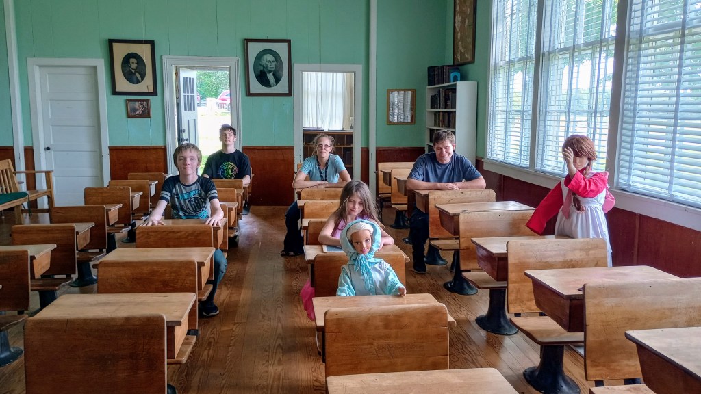 We enjoyed visiting the Clare Historical Museum complex, which includes a museum, historic log home, blacksmith shop, and historical school. It was amazing how small the homes were where people raised many children. Entire homes were smaller than the family room in many of today’s houses. Ringing the school bell was comical, as Alexandria is so lightweight that the cord pulled her up off the floor as it rang. This is an off-the-beaten-path museum that is interesting and well worth the trip.