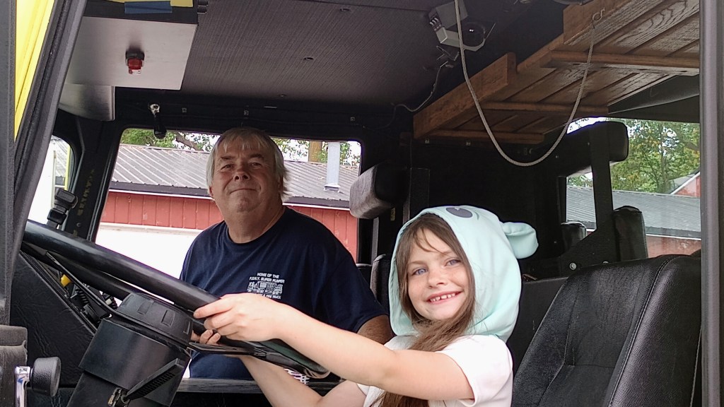 Alex wore a dress and heels, catching the eye of museum docent Dave by asking him a question. Dave toured us through the museum, letting her into a gated area where antique toys were on shelves, encouraged her to climb up into all the firetrucks, which were labeled “do not climb, and told her when she was done looking around, she was going to drive a real firetruck—which she did!  Alex drove a 38-foot firetruck with me in the passenger seat; Alex sat on Dave’s lap in the driver’s seat. We went around a rural block twice, with her turning the steering wheel and blowing the air horn when she saw people. I asked Dave how often they take kids out like that, and he said never; Alex is the only one. Definitely a once in a once-in-a-lifetime, memorable experience.