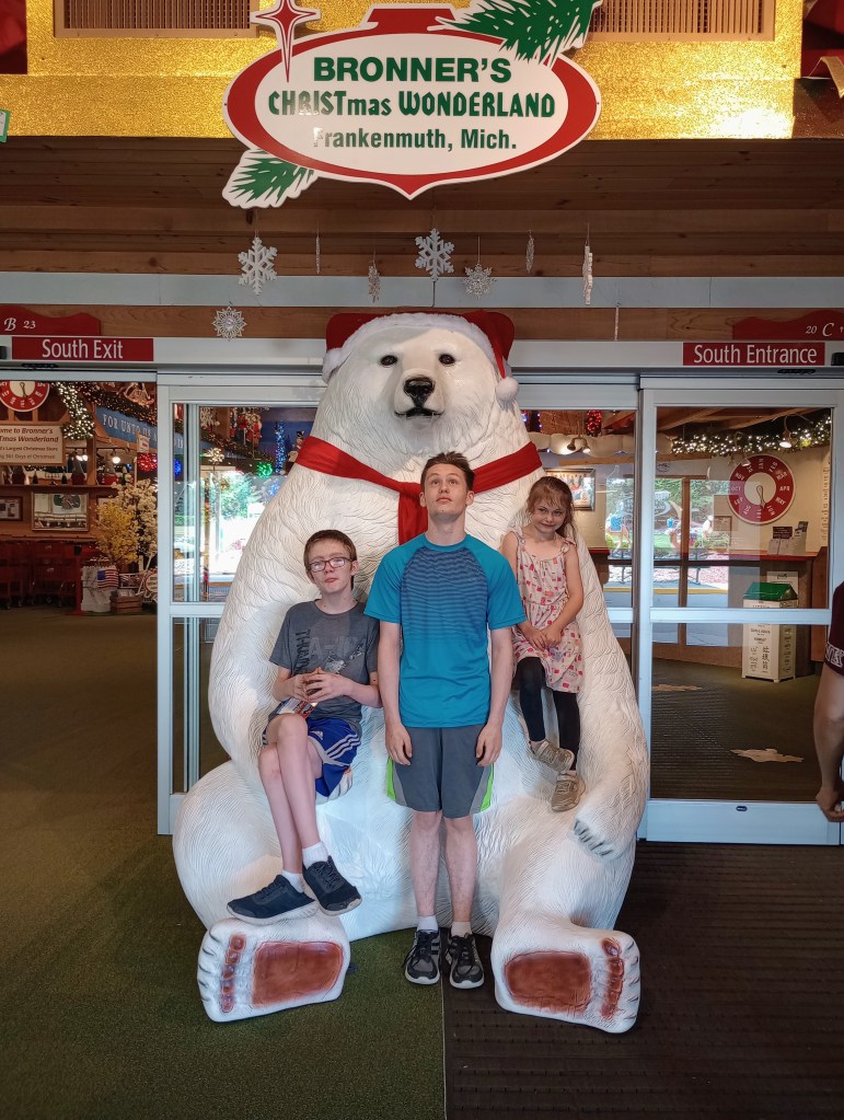 In addition to my individual outings with the kids, we had a couple family outings. These were harder to fit in because Caroline works 6-7 days a week. We did manage to coordinate an outing with all three kids to Bronner’s Christmas Wonderland in Frankenmuth. Bronners is the world’s largest year-round Christmas store, covering 2.2 acres plus 27 acres of landscaped grounds. If you are ever in Frankenmuth, Michigan, this is a must-see.
