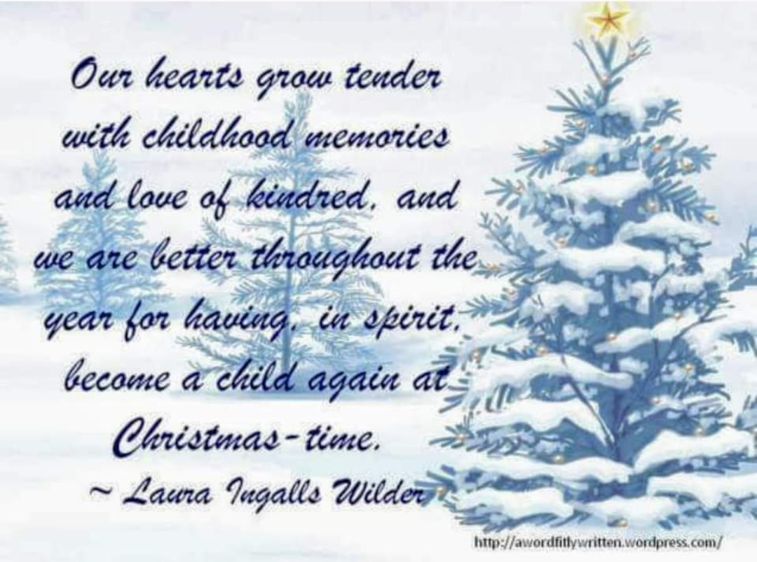 Our hearts grow tender with childhood memories and love of kindred, and we are better throughout the year for having, in spirit, become a child again at Christmas-time...Laura Ingalls Wilder