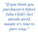 Used often is a large tub of dishwasher detergent tablets, but why do we have three containers of dishwasher cleaner?  I didn’t even know they made such a thing.  Apparently my husband, who does the majority of grocery shopping, saw and purchased it, twice.  It is a bit disconcerting to realize that an appliance in which you put dishes to be cleaned with hot water would itself need a cleaner run through it, but apparently it does. cleaning - if you purchased before julia child's last episode